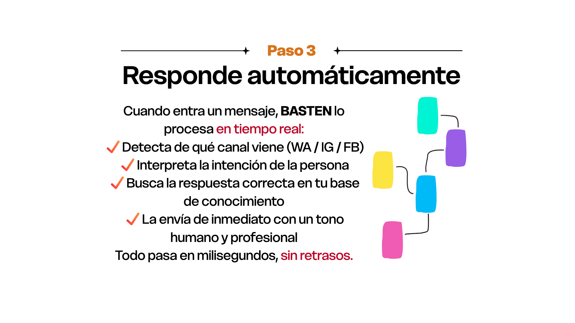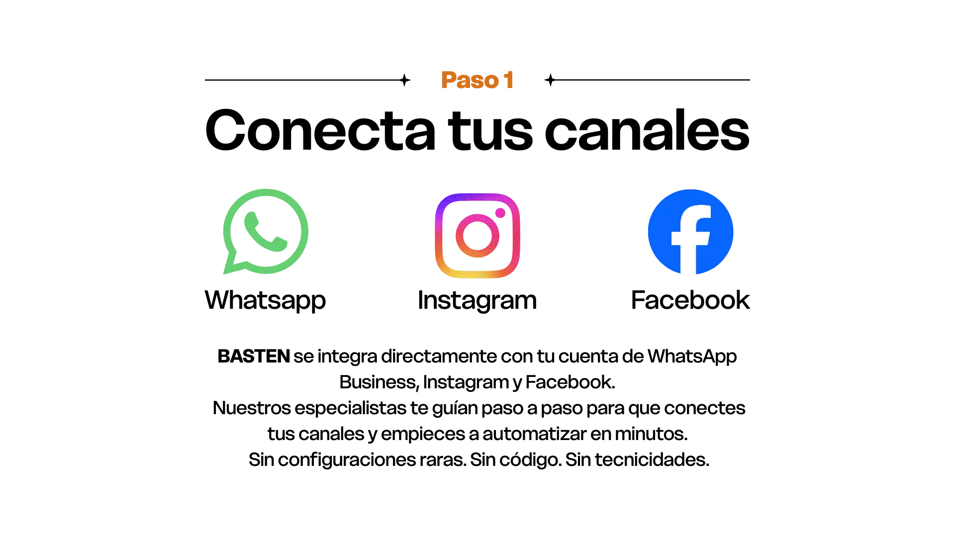 Con Basten centraliza todos los mensajes que recibe tu empresa en Whatsapp, Instagram y Facebook. Cada conversación se gestiona automáticamente según la información de tu negocio. Así respondes más rápido, atiendes mejor y nunca pierdes un cliente.